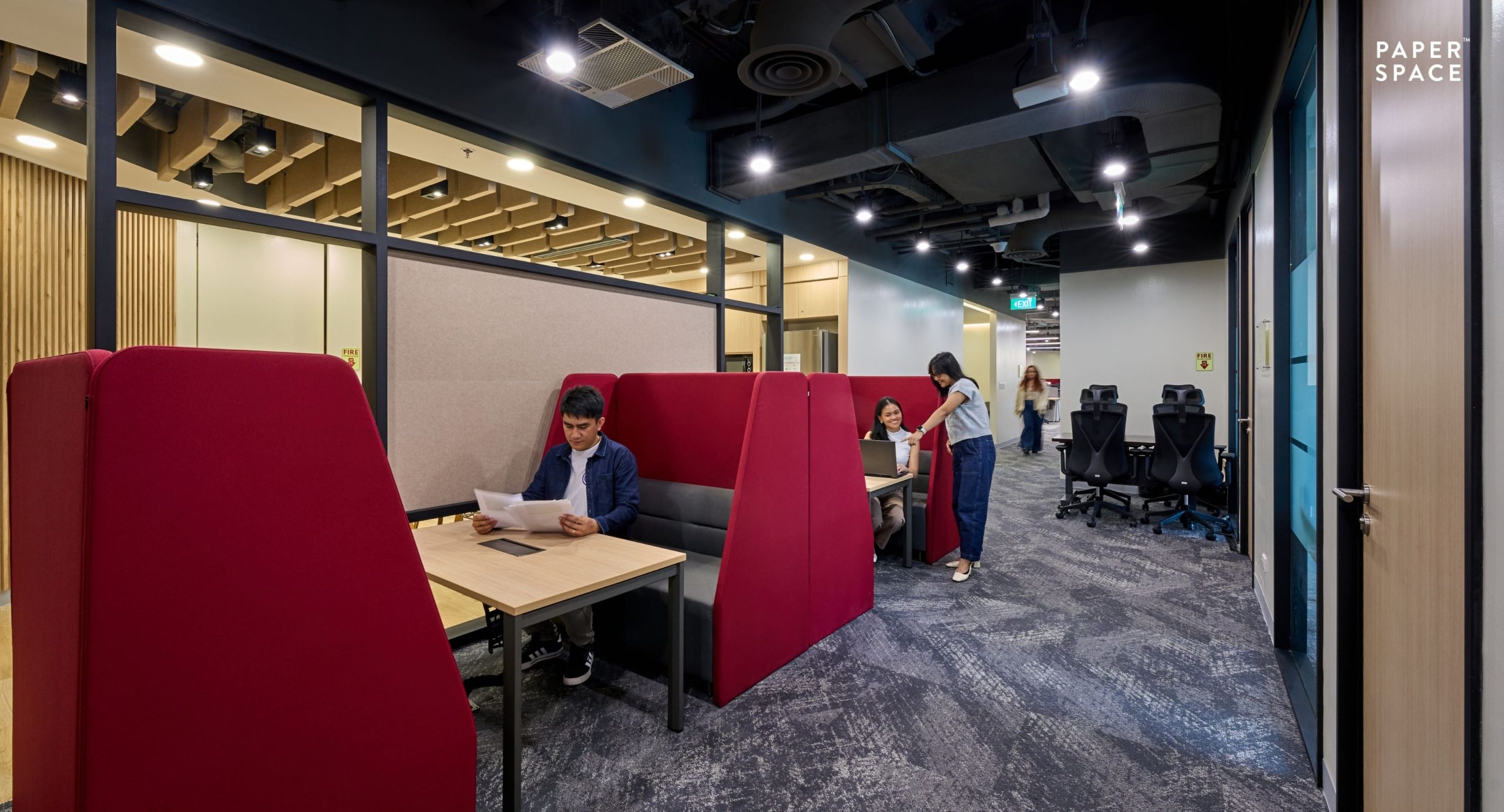 • Integrated work settings including built-in phone booths, collaboration zones, and repositioned meeting pods support hybrid work and flexible use
