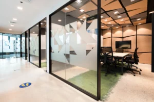 (Left) A Kantar Phillippines meeting room and (Right) a walkway lined with meeting rooms towards the workstations.