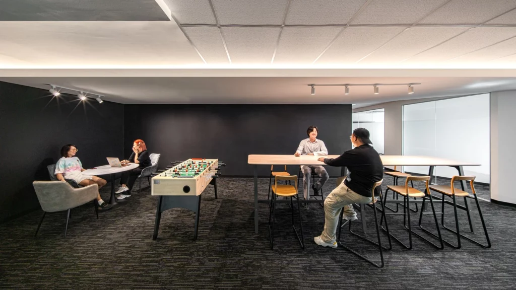 Upon entry, the media wall in the reception area showcases the company’s diverse media content. Meanwhile, the town hall area on the left features organic lighting accents. This multifunctional space can be adapted for various company activities, showcases, and photoshoots.
